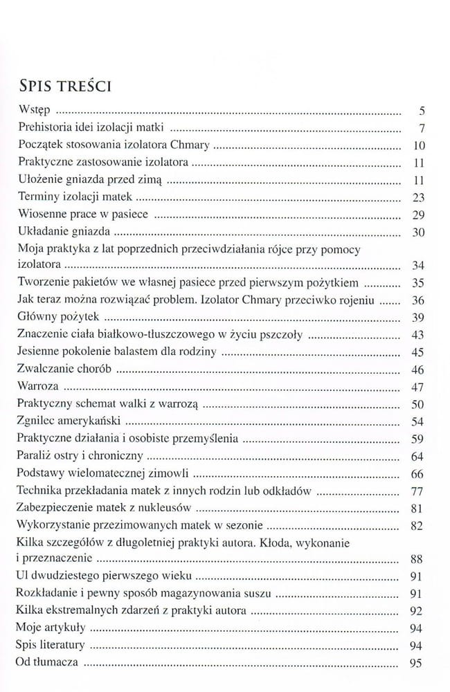 Książka opisuje praktyczne zastosowanie izolatora Petra Chmary. Znajdziemy w niej między innymi opis ułożenia gniazda przed zimą z matką przetrzymywaną w izolatorze; dowiemy się w jakich terminach najlepiej izolować matki; podane są zasady przeciwdziałaniu rójce przy pomocy izolatora i zwiększenia zbioru miodu; znajdziemy praktyczny schemat walki z warrozą, czy opisane podstawy wielomatecznej zimowli i wiele innych interesujących zagadnień oraz wiele innych praktycznych wskazówek. Opisywany izolator do nabycia w naszym sklepie.